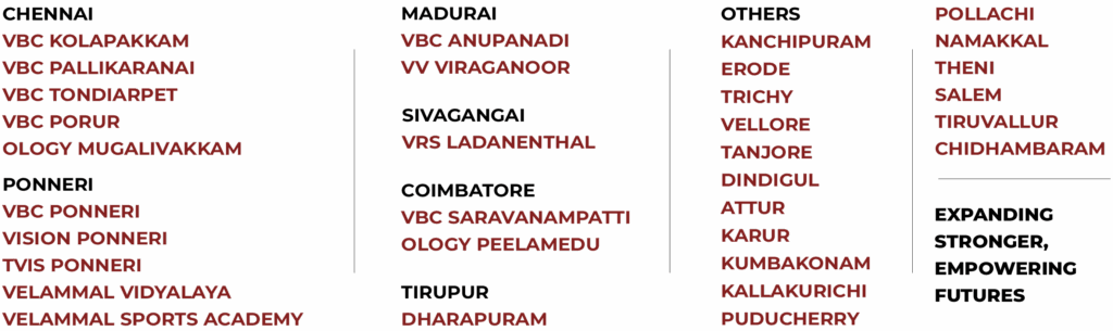 Currently, there are a total of 19 institutions within the Velammal Bodhi network.